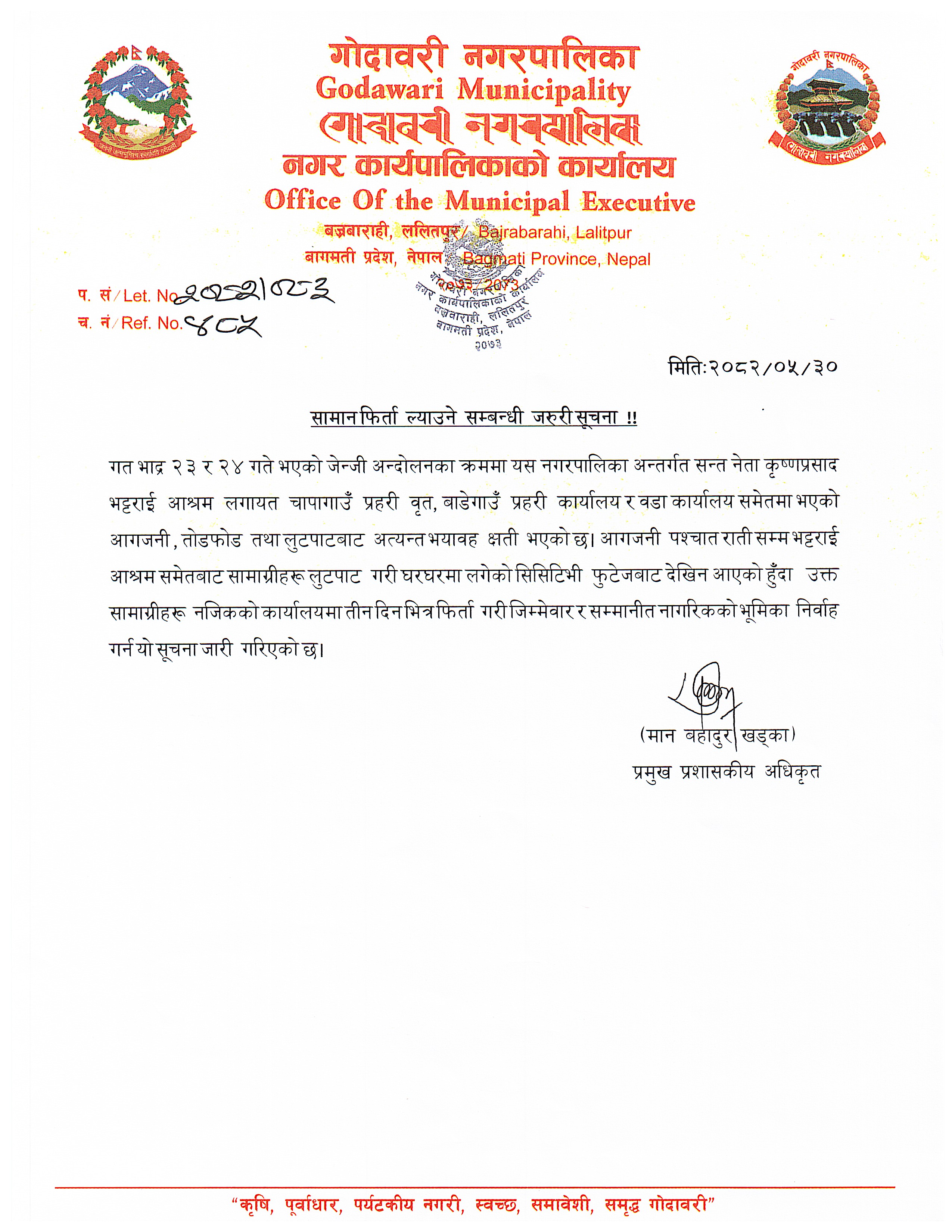 गोदावरी नगरपालिका अन्तर्गत वडा नं. १२, ठेचोस्थित गोदावरी नगरपालिका अस्पतालको ब्लक–बी भवन निर्माण सम्बन्धी आर्थिक प्रस्ताव खोल्ने बारे सूचना।