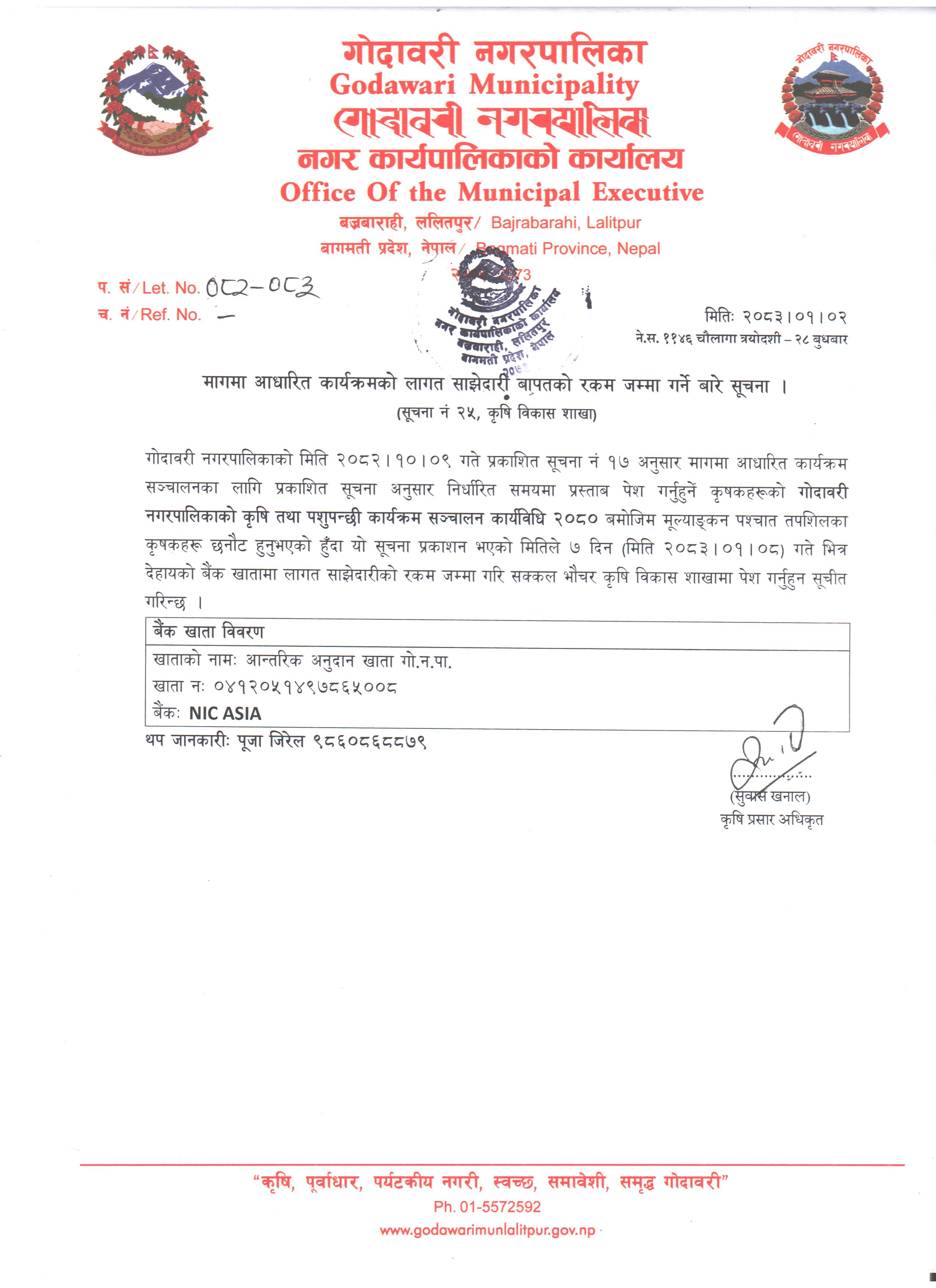 मागमा आधारित कार्यक्रममा लागत साझेदारी बापतको रकम जम्मा गर्ने बारे सूचना ।