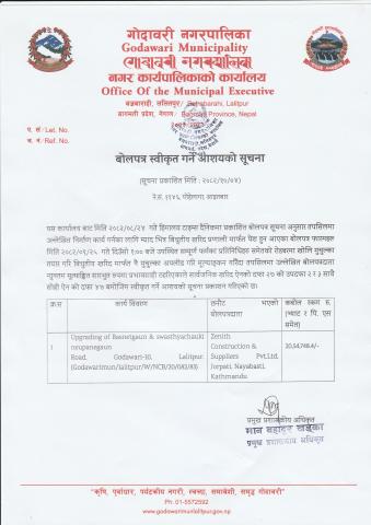 गोदावरी नगरपालिका वडा नं १०, ललितपुरस्थित बस्नेटगाउँ तथा स्वास्थ्यचौकी,नेउपानेगाउँ सडक स्तरोन्नति सम्बन्धी बोलपत्र स्वीकृत गर्ने आशयको सूचना।