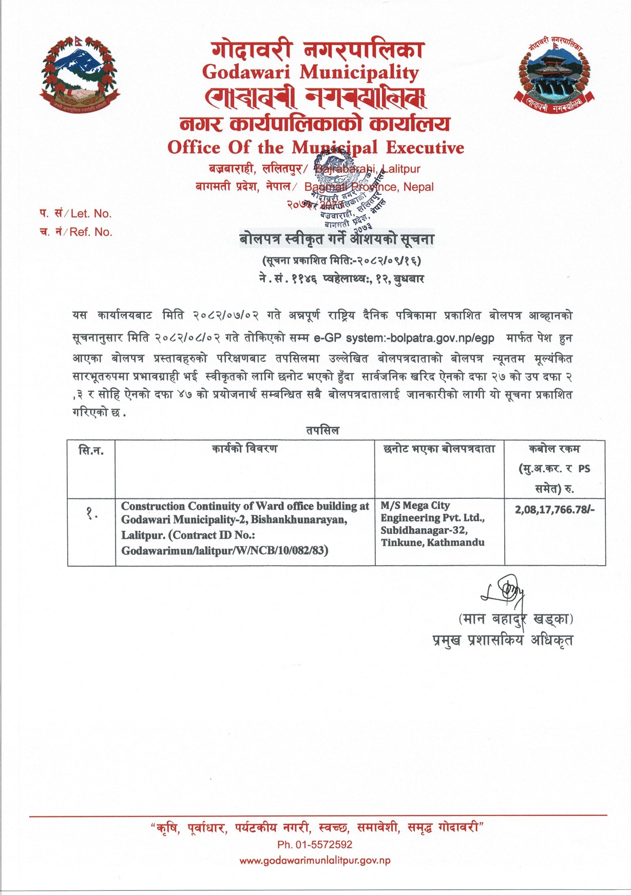 गोदावरी नगरपालिका वडा नं. ५, लेले स्थित पहाडी क्षेत्र, ललितपुरमा कल्भर्ट निर्माण कार्य सम्बन्धी बोलपत्र स्वीकृत गर्ने आशयको सूचना।