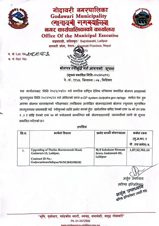 बोलपत्र स्वीकृत गर्ने आश्यको सूचना .