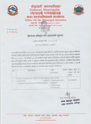 गोदावरी नगरपालिका वडा नं ११, ललितपुर स्थित वाखा टोल तथा देउबु मार्गमा पूर्वाधार सुधार कार्य सम्बन्धी बोलपत्र स्वीकृत गर्ने आशयको सूचना।