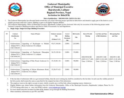 » विभिन्न सडक सुधार सम्बन्धी आयोजनाहरूका लागि बोलपत्र आह्वान(Invitation for Bids (IFB)))