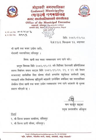 आर्थिक वर्ष २०८२/०८३ को बाँकी अवधिमा गोदावरी नगरपालिका भित्रका स्वीकृत खानी क्षेत्रबाट निकासी हुने ढुंगा, गिट्टी, बालुवा, माटो, स्लेट लगायतका प्राकृतिक स्रोतहरूको निकासी तथा नगर पूर्वाधार उपयोग बापतको आय शुल्क संकलन कार्य सम्बन्धी बोलपत्र आह्वानको सूचना।