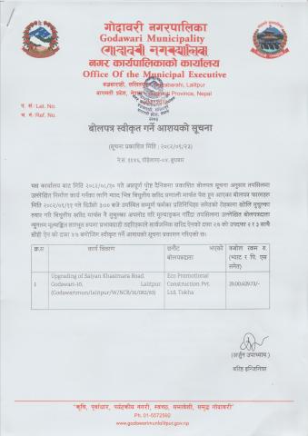 गोदावरी नगरपालिका वडा नं ११, ललितपुर स्थित वाखा टोल तथा देउबु मार्गमा पूर्वाधार सुधार कार्य सम्बन्धी बोलपत्र स्वीकृत गर्ने आशयको सूचना।