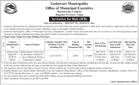 गोदावरी नगरपालिका वडा नं. ३ को सिमानादेखि वडा नं ४ को घट्टेकुलो पुलसम्मको सडक कालोपत्रे कार्य सम्बन्धी बोलपत्र आह्वानको सूचना।