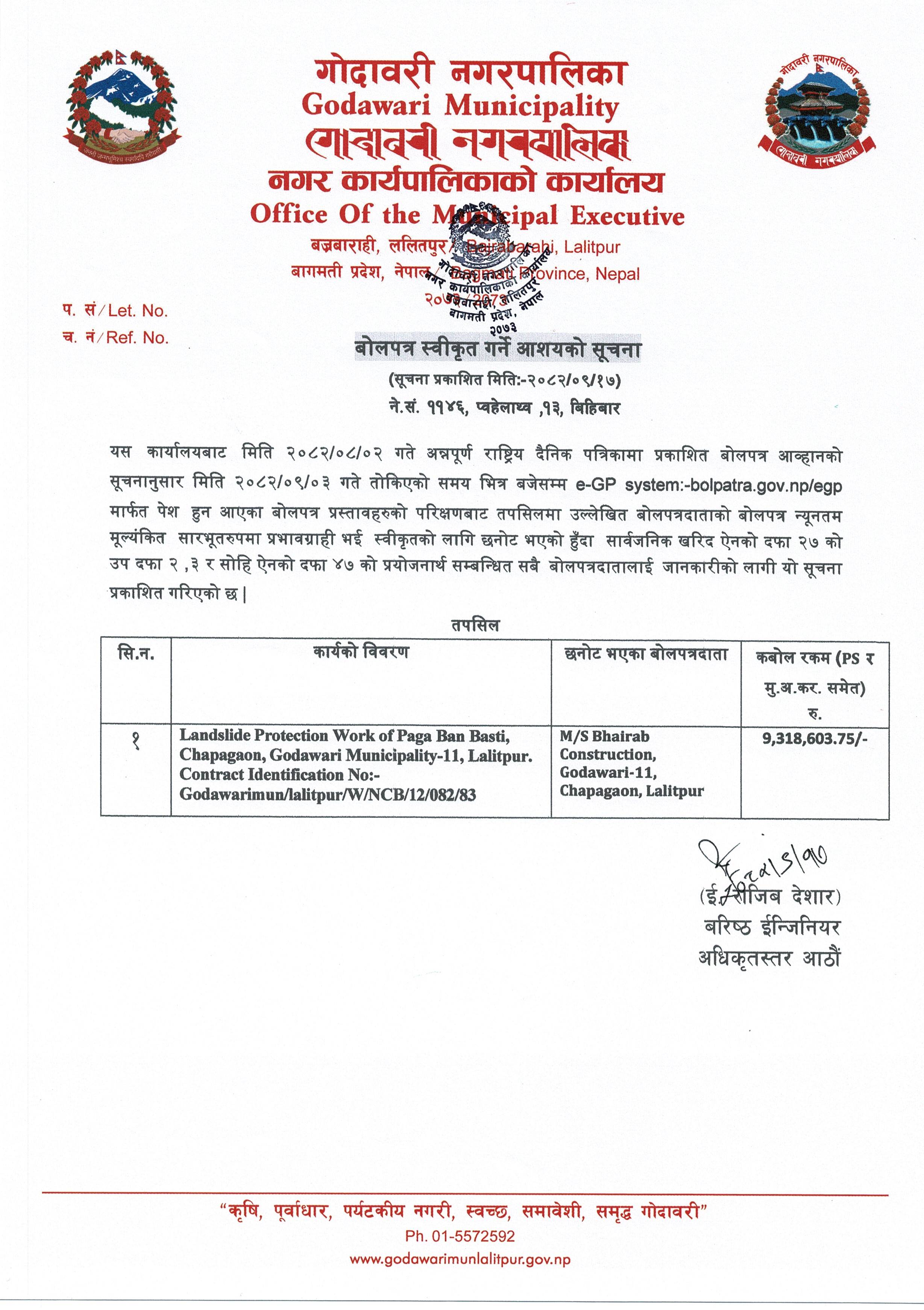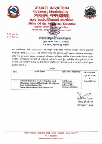 गोदावरी नगरपालिका वडा नं ११, ललितपुर स्थित वाखा टोल तथा देउबु मार्गमा पूर्वाधार सुधार कार्य सम्बन्धी बोलपत्र स्वीकृत गर्ने आशयको सूचना।