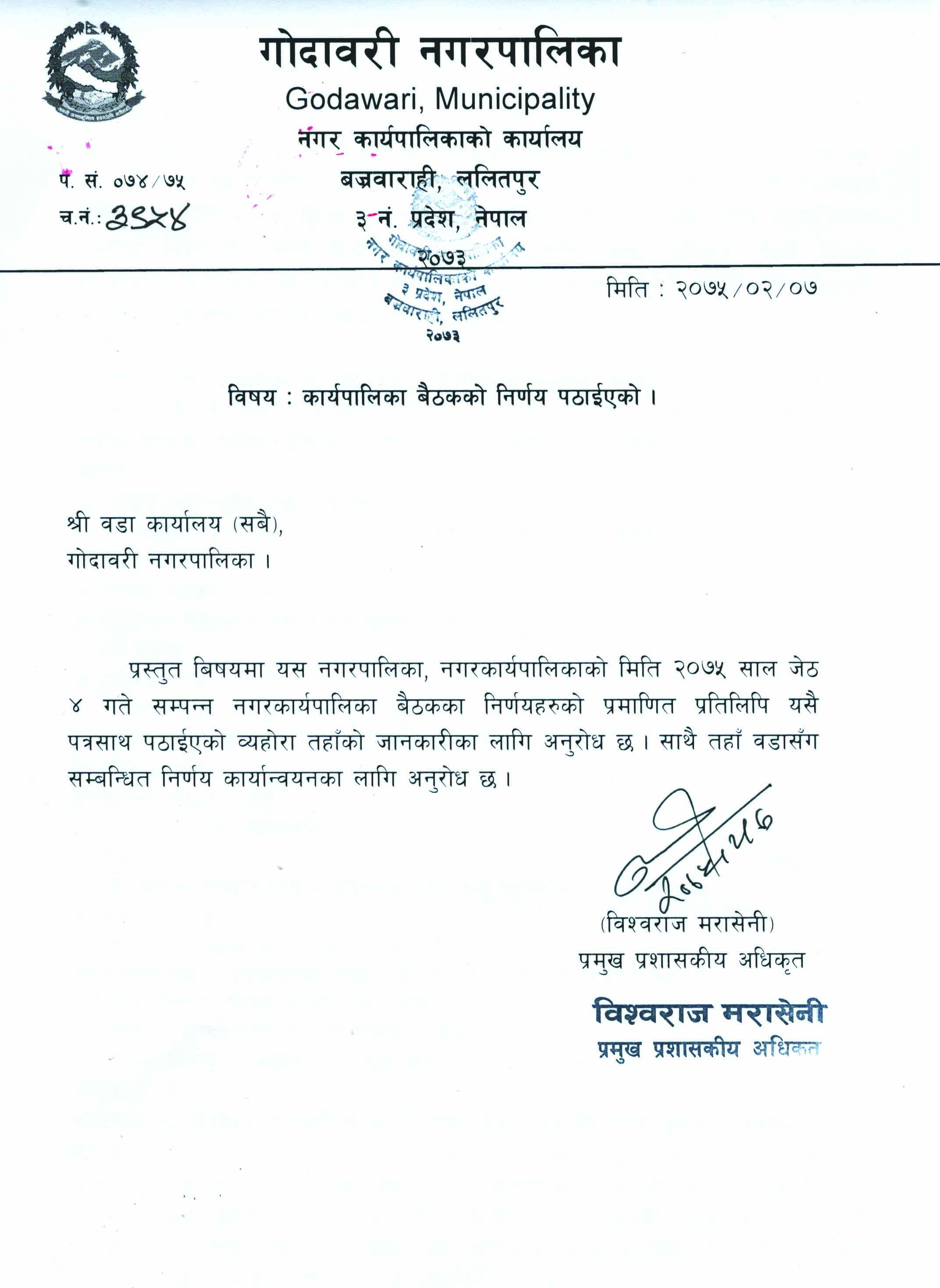 » मिति २०७५ जेठ ४ गतेको नगर कार्यपालिका बोर्ड बैठकको निर्णयहरु-