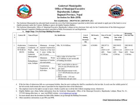गोदावरी नगरपालिका वडा नं ११, ललितपुरमा ज्येष्ठ नागरिक दिवस सेवा भवन तथा भ्वय छेँ निर्माणका लागि लागत अनुमान रु. ९९,१५,९४५.६५।-को बोलपत्र स्वीकृत गर्ने आशयको सूचना।