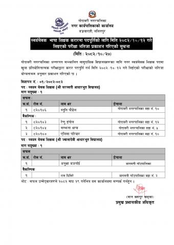 स्वयंसेवक भाषा शिक्षक करारमा पदपूर्तिको लागि मिति २०८२/१०/१२ गते लिइएको परीक्षाको नतिजा प्रकाशन गरिएको सूचना।